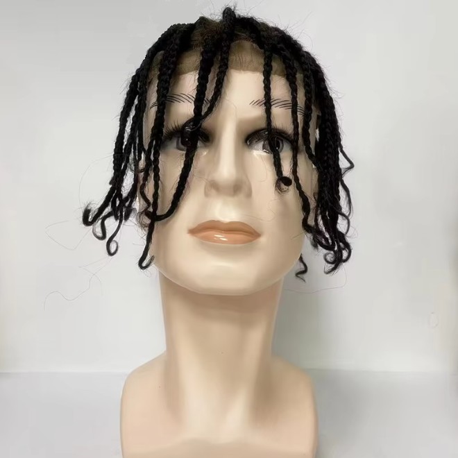 Wholesale of Long Box Braided Mens Human Hair Wig, Remy Human Hair Systems Afro Curl Black Box Braids Lace Base Wig