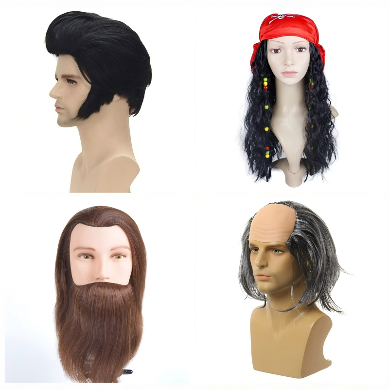 Wholesale of 3 Pcs Black Rock N Roll Star Elvis Presley Wig, Human Hair Costume Wig with Beard, 3 Pcs Black Curly Pirate Captain Cosplay Costume Long Hair Wig with Eye Patch Skull Turban and 4 Pcs Bald Kinky Curly Fluffy Wig For Halloween Costume Cosplay.